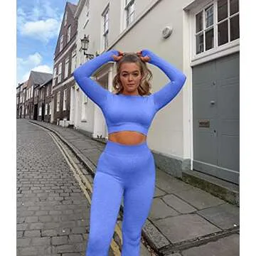 OYS Women's Workout 2 Piece Outfits Seamless High Waist Yoga Leggings Running Sports Long Sleeve Gym Sets Blue