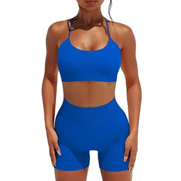 OYS Workout Set for Women 2 Piece Seamless Ribbed Yoga Outfits Active Strappy Bra Gym High Waisted Clothes Blue