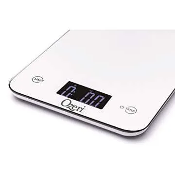 Show moreThe Ozeri Touch Professional Tempered Glass Digital Kitchen Scale in a sleek white design epitomizes elegance and functionality in your kitchen. This innovative scale features advanced touch-sensitive buttons that provide seamless operation, ensuring you can weigh your ingredients with just a gentle tap. Furthermore, its large LCD screen offers clear visibility, displaying weights in various units including pounds, kilograms, grams, and ounces (lb/oz, kg/g, fl.oz., ml), making it incredibly versatile for all your cooking and baking needs. The beautiful colored tempered glass surface is not only visually appealing but also boasts a strength that is four times greater than normal glass, combining durability with outstanding design. Equipped with four high-precision GFX sensors, the Ozeri Touch Kitchen Scale delivers accurate measurements ranging from 0.05 oz to 12 lbs (1 gram to 5750 grams). This high degree of precision ensures that every recipe turns out exactly as intended, making it a favorite among cooking enthusiasts and professional chefs alike. One standout feature is the Precision Tare function, which allows you to calculate the net weight of your ingredients by automatically subtracting the weight of the container. This saves you time and effort, ensuring a hassle-free cooking experience. Additionally, the scale comes with two Lithium batteries and features an easy-access battery compartment that does not require a screwdriver for replacements. Overall, this kitchen scale blends style with practicality, making it an essential tool for every kitchen, be it home or professional. Whether you're an amateur cook or a seasoned chef, the Ozeri Touch Professional Kitchen Scale brings precision and ease to your culinary creations. In this competitive world of kitchen gadgets, this scale stands out as a reliable and charming addition to your countertop.