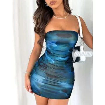 OZICERD Summer Tube Mini Dresses for Women Trendy Y2k Ruched Going Out Club Rave Outfit Bodycon Short Bandeau Dress Blue Green S