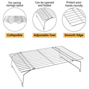 But what truly sets this cooling rack apart are its flexible feet. Featuring a swingable design that opens to a height of 3.5 inches, this rack can also collapse down to a mere 1.3 inches for easy storage in kitchen cabinets or drawers. This makes it perfect for compact kitchens while still boasting the capacity to handle larger batches of cookies, pastries, meats, and more!