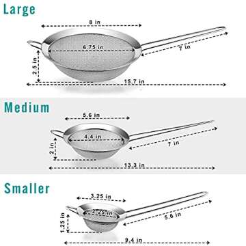 P&P CHEF Fine Mesh Strainer Set of 3, Stainless Steel Mesh Sieve Drink Food Strainer Flour Sifter with Long Handle, 3.25” & 5.6” & 8” Inches for Filtering Sifting Rinsing, Easy Clean & Durable