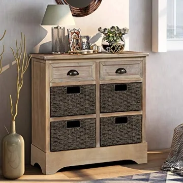 Show moreIntroducing the **P PURLOVE Storage Chest**, a stunning mix of function and décor designed for your living space. This storage cabinet showcases a charming white-washed wood finish that beautifully highlights the natural grain, ensuring it adds a hint of rustic elegance to any room. With dimensions of **28"L x 11.8"W x 28"H** and a weight of **27.6 lbs**, this piece is compact enough to fit snugly into smaller areas yet provides Generous storage options for your belongings. Featuring **two sturdy wood drawers** and **four wicker baskets**, this storage unit offers you ample capacity to safely store your essentials, from snacks and books to decorative items. Crafted with a solid wood (acacia) frame and durable MDF top, it promises stability and long-term use while ensuring your floor remains scratch-free with rubber mats included. Enjoy the beauty of functionality that makes this storage chest a must-have!