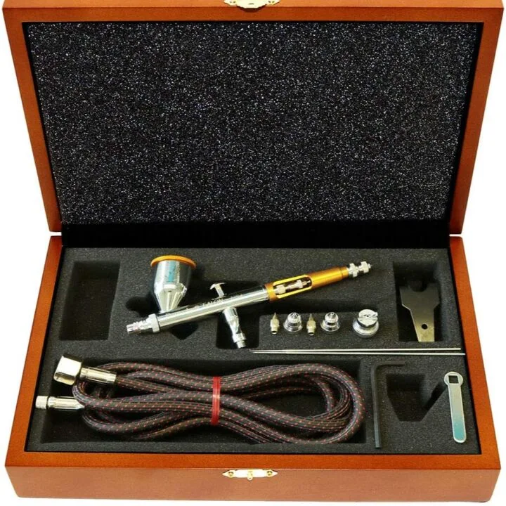 LessThe set includes the airbrush, three different head sizes (.25mm, .38mm, .66mm), a fan air cap, and a deluxe wooden case for storage.