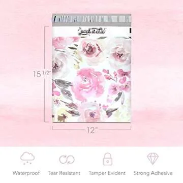 Show more Introducing the Pack It Chic - Floral Flowers Thank You Poly Mailer Envelopes, a delightful fusion of functionality and style! Measuring 12 inches by 15.5 inches, this 100 pack is perfect for retailers, crafters, and anyone who loves making a lasting impression. These unpadded envelopes are crafted with high-quality materials to withstand the rigors of shipping, ensuring your items reach their destination safely while being adorned with a charming floral design. Whether you're mailing clothing, accessories, or handmade goodies, these envelopes not only promise durability but also bring a touch of elegance to your packaging.