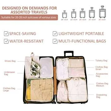 Show moreIntroducing the ultimate travel companion, the Packing Cubes for Travel - a meticulously designed 9-piece luggage organizer set that redefines how you pack for your journeys. Engineered with different compression cell sizes, these cubes cater to every type of item you bring along, from larger bags for sweaters and pants to smaller ones for shoes and accessories. Made from lightweight, water-resistant fabric, they ensure that your belongings stay dry and protected. Every cube features durable zippers and firm stitching, creating a reliable solution that makes packing less stressful and unpacking a breeze.
