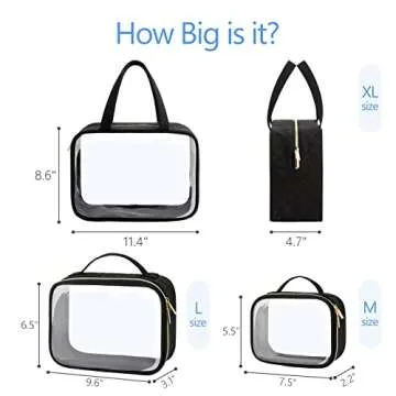 Show moreIntroducing the PACKISM Clear Toiletry Bags – your ultimate travel companion! This set comprises three elegantly crafted clear cosmetic bags, available in graduated sizes: medium (7.8 x 2.3 x 5.9 inches), large (9.8 x 3.1 x 6.6 inches), and x-large (11.4 x 4.7 x 8.6 inches). Designed with functionality in mind, the medium size bag is TSA approved for effortless travel. Each bag features an innovative zip-around opening that grants an amazing 180% access, allowing you to efficiently view and retrieve your items without any hassle.
