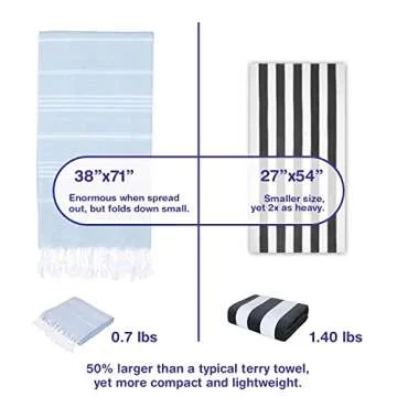 Show more Elevate your travel experience with the PADISHAHHOME Turkish Beach Towels – a pack of two oversized, ultra-soft beach towels designed to enhance your adventures near water. Measuring 38x71 inches, these luxurious towels are crafted from 100% Turkish cotton, ensuring an incredibly soft touch against your skin. Unlike standard terrycloth towels, these are thinner yet remarkably absorbent, allowing you to travel light without compromising on comfort or performance. Their compact nature means they easily slide into any bag, making them your perfect companions for beach trips, pool days, or anywhere adventure calls.