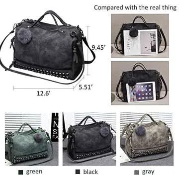 Show moreIntroducing the Pahajim Women’s Studded Tote Handbag - the ultimate blend of chic punk style and everyday functionality. This handbag is crafted from high-quality nubuck and artificial leather, ensuring durability while maintaining a stylish look. Designed with multiple compartments, it’s spacious enough to carry everything from your essentials to a tablet, making it perfect for school, work, or a casual outing. The elegant studded design combined with a playful pom pom ball decoration adds a touch of flair, ensuring you stand out wherever you go. With dimensions of 12.6"L x 9.45"H x 5.51"W, the bag strikes an ideal balance between ample space and easy portability, weighing just 1.2 pounds.