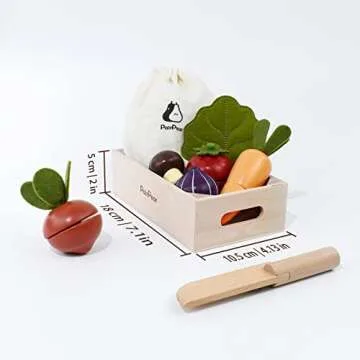 Show moreIntroduce your little one to the world of culinary creativity with this delightful wooden play food set, designed specifically for toddlers. This engaging set includes a colorful assortment of vegetables such as a carrot, beet, tomato, onion, and mushroom, along with a felt lettuce and a wooden knife, all contained within a charming wooden box. The play food features self-stick tabs that provide a unique cutting experience, allowing kids to slice through the pieces with a satisfying sound. It’s a wonderful way for children to mimic their parents in a safe manner, enhancing their motor skills and hand-eye coordination.