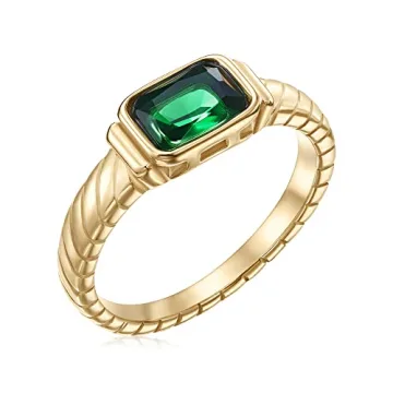 The ring features an emerald-cut green CZ stone, which offers a brilliant look similar to natural emeralds.