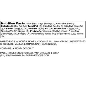 With an emphasis on pure, wholesome ingredients, our cookies are made with almonds as the first ingredient, packing 18 almonds into every cookie! We use 100% cacao chocolate for rich flavor, high-quality honey for natural sweetness, and coconut oil to provide healthy fats. Plus, you won’t find any fillers here! Just deliciousness in every crumb.