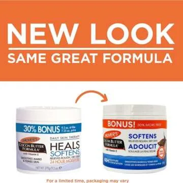 Show moreIntroducing the Palmer's Cocoa Butter Bonus Size Jar, a luxurious 9.5-ounce jar filled with nature's finest moisturizer. This creamy and rich formula harnesses the hydrating powers of cocoa butter to deliver intense moisture to dry and rough skin. Ideal for preventing stretch marks, this bonus size jar ensures you have enough product to pamper and nourish your skin every day. The delightful cocoa scent adds a sensory pleasure to your daily skincare routine, making it a treat for the senses. Whether you’re battling winter dryness or simply seeking daily hydration, this cocoa butter is your go-to solution for maintaining soft, supple skin.