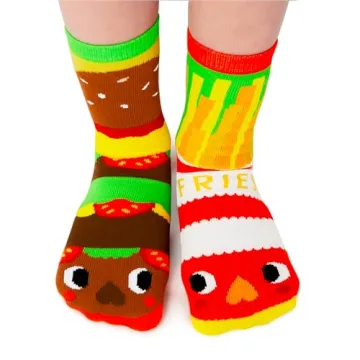 Show more Introducing the Pals Burgers & Fries Crew Socks for Kids, the perfect blend of fun and functionality designed to brighten up your child's wardrobe! These funky mismatched socks feature a delightful combination of food-themed designs that every kid will love, encouraging individuality and creativity. Made from a premium blend of cotton, polyamide, and spandex, these socks promise a snug and comfortable fit, ensuring that your little one's feet stay cozy throughout the day. The coolest part? They come equipped with non-slip grips on the bottom, making them not only stylish but also safe for kids who love to play and explore!