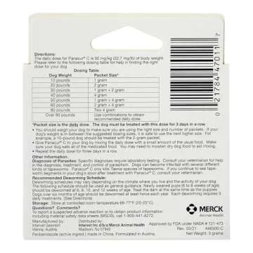 Show morePaw-sitively remarkable, the Panacur C Canine Dewormer is designed to safeguard your beloved furry friend from intestinal parasites with ease and efficiency. Each pack contains three 1-gram packets, carefully formulated to treat dogs weighing up to 10 lbs per dose. This dewormer features a potent formula that helps eliminate a wide variety of worms, including roundworms, hookworms, and tapeworms, ensuring your dog’s health and vitality. Easy to administer, the granules can be mixed with food or given directly, making worming your pet a hassle-free experience!