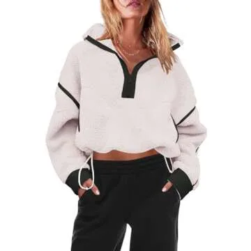 Show more Introducing the ultimate in cozy fashion, this women's half zip fleece pullover is a must-have for anyone looking to stay warm and stylish during the chilly months. Crafted from a premium polyester blend, this pullover features fluffy teddy fleece that is extraordinarily soft to the touch, wrapping you in a cloud of warmth. Whether you are heading out for a casual brunch or enjoying a cozy night in, this pullover promises not to disappoint.
