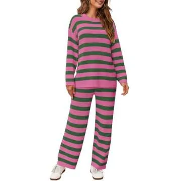 Panadila Womens Oversized Lounge Sets Striped Sweater Set 2 Piece Pajama Set Long Sleeve Top and Pants with Pockets(Pink Green Combo,M)