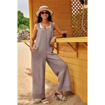 Panadila Womens Waffle Knit Jumpsuit Casual Wide Leg Jumpsuits Oversized Long Rompers Open Back Loose Overalls(Grey Pink,S)