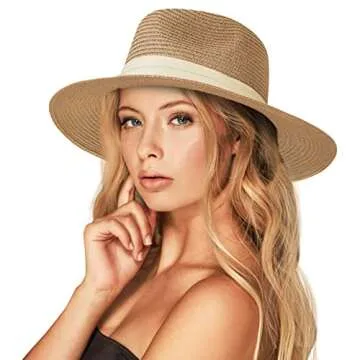 Panama Hats for Women with 2 Hat Clips Summer Wide Brim Fedora Sun Hat Roll Up Straw Hat UPF 50+, A-Khaki & Off White