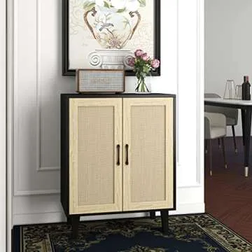 Panana Buffet Cabinet Sideboard with Rattan Decorated Doors Kitchen Storage Cupboard Accent Cabinet (Black)