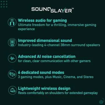 Show more The Panasonic SoundSlayer Wireless Wearable Speaker System redefines your audio experience, bringing immersive sound to life like never before. Designed especially for gamers, movie enthusiasts, and music lovers alike, this lightweight neck speaker offers an unbeatable way to connect with your favorite entertainment. Thanks to its innovative TRUE MAGESS (True Majestic Augmented Gaming Environment Sound System) technology, the SoundSlayer delivers an astonishing 4-channel surround sound experience, putting you right at the heart of the action. Imagine feeling the pulse of every explosion, the weight of each note, and the subtle whispers in dialogues as though you're really there. With no pressure on your ears and ergonomic glory, this simply feels like a natural extension of your body.