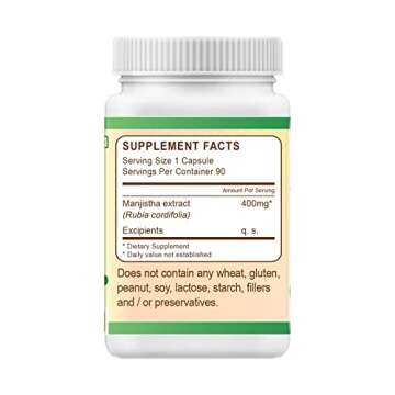 Panchaveda Panacea Herbals Manjistha Capsules (90 Veg Caps 400mg Extract) Rubia Cordifolia, Indian Madder for Glowing Skin Complexion. Gluten Free Lactose Free GMO Free Pure Herbal Dietary Supplement.
