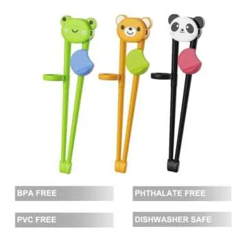 Show more Introducing the PandaEar Baby Chopsticks Training Set, the perfect tool to help your little ones embark on their culinary adventures! Constructed with 100% safe materials, these chopsticks are made from durable plastic and soft silicone, free from BPA, PVC, Latex, toxic metals, and phthalates. Designed with your child's safety in mind, they ensure a worry-free dining experience.