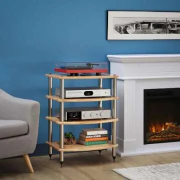 Pangea Audio Vulcan Four Shelf Audio Rack, Media Stand, and Components Cabinet 4 Shelf Natural Parawood with Silver Posts