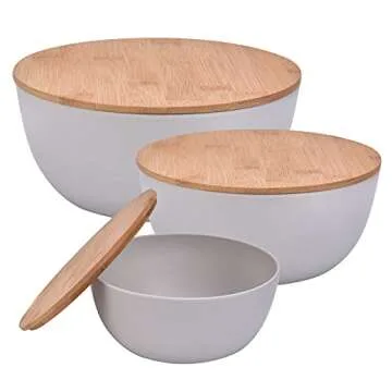 Show more Introducing the Panghuhu88 Salad Bowl with Lid, the perfect addition to your kitchen essentials! This beautifully crafted set features three versatile serving bowls in varying sizes of 7 inches, 8.8 inches, and 11 inches, making it ideal for salads, fruits, ice cream, cereal, or any dish you wish to serve. Made from durable, LEAD-FREE, and NON-TOXIC bamboo fiber material, these bowls not only ensure safety but also come with an elegant bamboo lid, enhancing their aesthetic appeal at your dinner table.