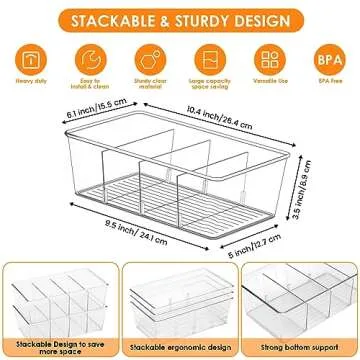 Show more Maximize Your Space with Hronta's Clear Storage Bins! Introducing the Hronta 4 Pack Clear Storage Bins, designed for anyone who wants to keep their kitchen, pantry, or fridge impeccably organized. These versatile bins not only offer a clear view of your items but are also equipped with removable dividers, giving you the flexibility to adjust the compartments to perfectly fit larger items. Crafted from high-quality BPA-free, shatter-resistant plastic, these bins are durable yet lightweight, making them easy to move around for cleaning or reorganization. The transparent design allows for immediate visibility, so you can quickly locate snacks, spices, tea bags, and more without the hassle of rummaging through your cabinets.
