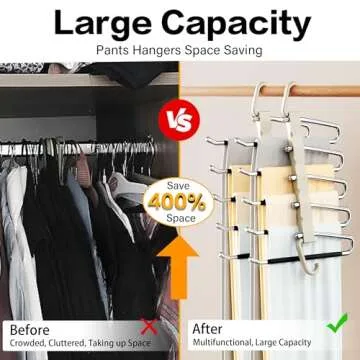 Show moreIntroducing the Pants Hangers Space Saving - 2 Pack, the ultimate solution for those seeking to maximize their closet space while keeping their pants organized and wrinkle-free. Designed with functionality in mind, each hanger features five layers, allowing you to comfortably store up to five pairs of pants, jeans, leggings, scarves, and skirts. Gone are the days of cluttered wardrobes and overflowing drawers; with this innovative storage solution, you can reclaim your closet and enjoy a clean, tidy environment. Perfect for small closets, apartments, and dormitories, these hangers save up to 400% of your closet space, making them a must-have for anyone short on storage.