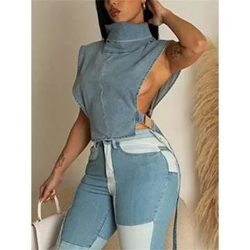 PAODIKUAI Women's Sleeveless Denim Crop Top Vest Y2K Sexy Summer Jean Vest Shirt Tank Tops Waistcoat Jacket (A-light blue-L)