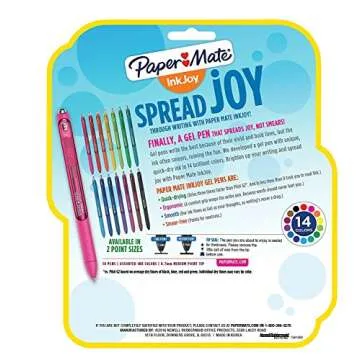 Show moreUnleash your creativity with the Paper Mate InkJoy Gel Pens, a vibrant set of 10 medium point pens that redefine the art of writing. Designed for both the artist and the writer in you, these gel pens feature a unique quick-drying formula that dries **three times faster** than traditional inks, significantly reducing smearing. This makes them perfect for everything from hand lettering and bullet journaling to everyday note-taking. Each pen boasts a colorful array of hues, ensuring your work is not only legible but also visually striking.