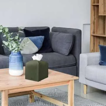 PARIERIS Tissue Box Cover Holder Square Tissue Cube Cover PU Leather Tissue Organizer with Bottom Belt for Bathroom, Tabletop, Car, Night Stands, Office, Home, Kitchen (1, OliveGreen)