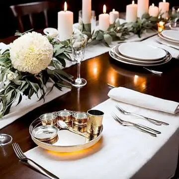 Show moreIntroducing the PARIJAT HANDICRAFT Indian Dinnerware Set, a stunning collection that beautifully merges tradition with functionality. This exquisite dinnerware set includes three bowls, a water glass, a large dinner plate (thali), a dessert spoon, and a sweet dish, perfect for impressing your guests at any gathering. Its elegant design made from stainless steel, enhanced with copper accents, adds a touch of sophistication to your dining experience.