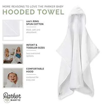 Show more Introducing the Parker Baby Co. Premium Hooded Toddler and Kid Bath Towel - the ultimate blend of comfort, size, and quality for your little ones! Measuring at a generous 40" x 29" for infants and 52" x 29" for kids, this luxurious towel is crafted from 100% soft ringspun cotton. It's designed to lovingly envelop your child in plush warmth after bath time, making it an essential item for newborns and toddlers alike. With a centered hood for easy wrapping and a specially formulated dye-free fabric that is gentle on sensitive skin, your child's comfort and health are our top priority. Join the growing number of happy parents who've found the perfect solution for post-bath cuddles with our thick, absorbent towel that ensures optimal warmth and dryness.