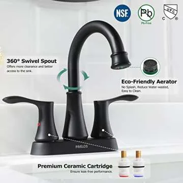 Introducing the PARLOS 2-Handle Bathroom Sink Faucet, an elegant blend of functionality and sophisticated design, perfect for any contemporary bathroom. This high arc swivel spout allows for full 360-degree rotation, providing versatility and convenience for various tasks, from handwashing to filling up containers. Crafted from premium materials, this faucet is designed to last, featuring a stunning Matte Black finish that not only enhances its visual appeal but also ensures durability and reliability. Ideal...