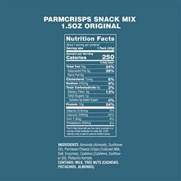 Show more If you're looking for a deliciously crunchy and nutritious snack, look no further than the ParmCrisps Snack Mix. This delightful mix includes six 1.5 oz bags of the original flavored ParmCrisps, combined perfectly with an assortment of high-quality nuts such as almonds, cashews, and pistachios. Made simply with 100% cheese crisps, this snack mix embodies a blend of taste and health, making it an ideal choice for anyone who values quality snacking without sacrificing flavor.