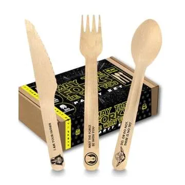 Show more Transform your next gathering into an intergalactic culinary experience with the brilliantly themed Party Supplies “May The Forks Be With You” Wooden Cutlery Set. Featuring a stellar combination of 45 disposable pieces—15 forks, 15 spoons, and 15 knives—this set is perfectly designed to serve up to 15 guests. Collectively adorned with iconic quotes from the Star Wars saga, these utensils not only enhance your table setting but also spark conversations among fans and foodies alike. Crafted from sustainable wood, they are eco-friendly, biodegradable, and compostable, making them an ideal alternative to plasticware. Whether you’re celebrating a birthday, hosting a themed party, or simply indulging in your love for Star Wars, this cutlery set combines functionality with a playful nod to one of the most beloved franchises in film history.