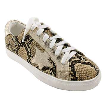 Show moreStep into the spotlight with the PARTY Women's Fashion Star Sneaker, designed for those who embrace both style and comfort. The Dale-Gold Met Snake design offers a luxurious yet trendy appearance, perfectly blending shimmering tones with a sleek silhouette. These comfortable lace-up walking shoes feature a cushioned insole that cradles your feet, making each step feel light and effortless. Ideal for casual outings or active days, this sneaker is built not just for look, but also for lasting support through your daily adventures.