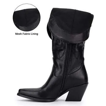 Show more The perfect blend of style and comfort, these mid-calf cowboy boots for women embody a classic design that stands out in any wardrobe. Crafted with precision, they feature exquisite embroidery that pays homage to traditional western aesthetics. The boots are constructed with a robust rubber sole that provides excellent traction and durability, ensuring you can wear them for any adventure. Inside, the mesh fabric lining guarantees breathability, allowing your feet to stay dry and comfortable all day long.