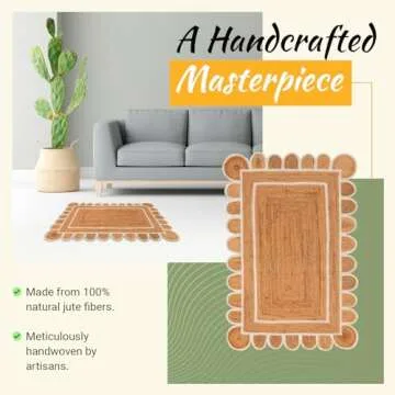 Show more Transform your living space into a bohemian wonderland with our exquisite Bohemian Charm Jute Rug! This meticulously handwoven area rug features an intricate scalloped design that brings warmth and character to any room. Crafted from natural jute, it serves as a stylish centerpiece, seamlessly enhancing your home decor with its chic elegance. Available in various sizes, including 4x6, 5x8, and 6x9, this rug is versatile enough for any area, whether you envision it as a hallway runner or a distinctive addition to your space.