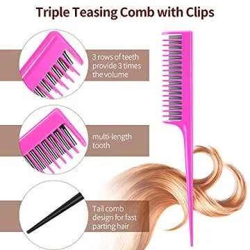 Patelai 3-Piece Hair Comb Set Includes 3-Row Nylon Teasing Brush, Boar Bristle Teaser Brushes, and Triple Teasing Combs for Women Stylists - Pink and Black