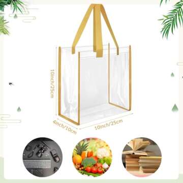 Show moreIntroducing the Paterr 20 Pack Plastic Clear Tote Bags, your ultimate companion for all events that require a dash of style and functionality! These stadium-approved bags are not only designed to comply with security restrictions at various venues, but also feature an eye-catching gold shoulder strap that adds a touch of glam to your essentials. Measuring a universal size of 10 x 10 x 4 inches, each bag provides plenty of space for everything you need, from suntan lotion to your favorite sunnies, making them perfect for sports, travel, or daily use.