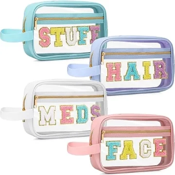 Show more Introducing the Paterr 4 Pieces Chenille Letter Clear Makeup Bags, the ultimate solution for beauty enthusiasts who value both style and functionality. These bags go beyond mere pouches; they offer a generous amount of space, allowing you to neatly store your full-sized makeup essentials without feeling cramped. With a kaleidoscope of vibrant colors and charming designs, these bags are sure to brighten up your vanity or travel kit. Made from high-quality nylon, they feature a lovely chenille letter detailing that adds an extra touch of personalized flair. These bags are specifically designed for those who appreciate aesthetic appeal, practical storage, and durability.