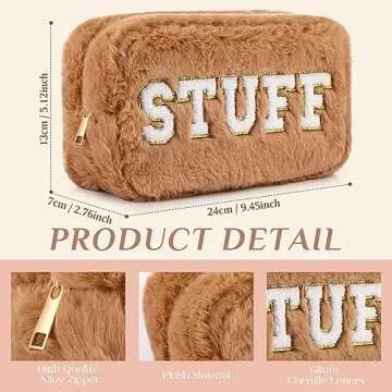 Show moreIntroducing the Paterr 4 Pieces Chenille Letter Preppy Patches Makeup Bags – a chic blend of function and style designed specifically for the modern woman on the go! Crafted with luxurious imitation rabbit hair, these bags not only look adorable but also feel incredibly soft and fuzzy to the touch. The package includes four uniquely labeled bags featuring [FACE], [STUFF], [SKIN], and [HAIR], making organization effortless and stylish. Perfect for travel, each bag is an eye-catching accessory that brings a pop of color to your daily routine while helping you stay organized.