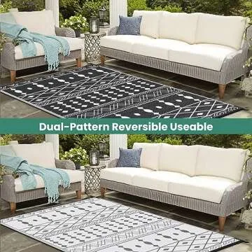 Show more The ultimate addition to your outdoor decor, this reversible outdoor rug features a stunning black and white crossover design that elevates any space from ordinary to extraordinary. Whether you have a cozy patio, a chic balcony, or a camp setup in nature, this rug is crafted to enrich your surroundings with its sleek and modern aesthetic. It’s perfect for anyone who desires to make their outdoor areas inviting and stylish.