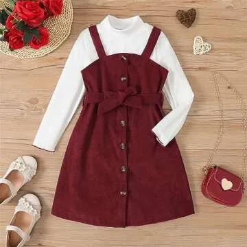 PATPAT Girl's 2 Pieces Dress Set Outfits Mock Neck Long Sleeve Crop Top and Button Down Two Strap Overall Christmas Dresses Sets Red 8-9 Years