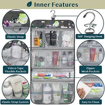 PAVILIA Hanging Toiletry Bag Women Men, Travel Kit Foldable Large Toiletries Organizer, Roll up Cosmetics Makeup Bag Accessories, Waterproof Essentials Jewelry Case (Floral Grey)