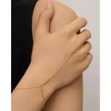 Show moreIntroducing the exquisite 14K yellow gold plated hand chain from PAVOI, designed to captivate and inspire admiration at every turn. This stunning piece effortlessly marries a bracelet and a ring, all while featuring a chic gold bead accent that adds a dash of charm. Measuring at a delicate 4.2 inches for the ring portion and a refined 3-inch chain, this hand chain is perfect for those who cherish elegance in simplicity.